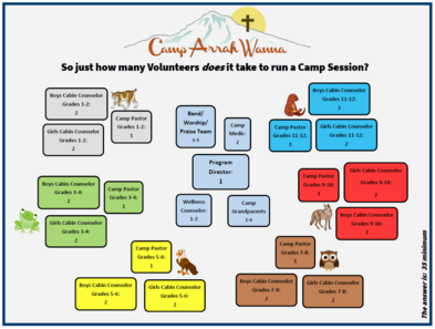 Are you interested in helping young people find hope, belonging, and purpose for their life and future as a child of God? There are precious few places in the world today where people are safely challenged to explore what "faith" means and how we can work together to create loving communities that include people of ALL ages, from ALL backgrounds, and ALL life experiences. Camp Arrah Wanna's Youth Programs are strategically planned around the truth that EVERY ONE of us are loved by the Great Creator God, and there are infinite ways to live out that love for ourselves and others. Serving as a Cabin Counselor, Medic, Wellness Counselor, or Camp Grandparent is one of the most rewarding ways to contribute your time and energy to empowering our campers on this journey!